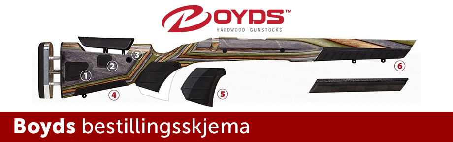 Gå til Boyds Gunstocks offisielle nettside og bruk konfiguratoren til å sette sammen din egen stokk og legg varen i handlekurven. Der finner du all informasjonen vi trenger for å gi deg et tilbud.