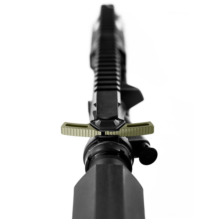 The Breek Arms WARHAMMER MOD2 ambi charging handle is a simple and affordable upgrade that will substantially increase the use of your AR-15. Easily grab on either side of the handle and you can quickly charge your rifle even with large gloves with the textured grooves that are cut into the latch handles. The wide set-back latches work great for large optics. The low profile design keeps it slim and sleek looking without sacrificing functionality. Made entirely out of 7075 aluminum for added strength and durability! The new MOD2 design features improvements for further reducing gas blowback in the shooter's face. The relief cuts on the top and bottom of the stem are designed to help direct extra gas out the side and away from your face. And for any gas that does manage to go straight back, we increased the height of the shelf to better cover the back of the upper. These modifications help improve the shooting experience, especially when shooting suppressed!