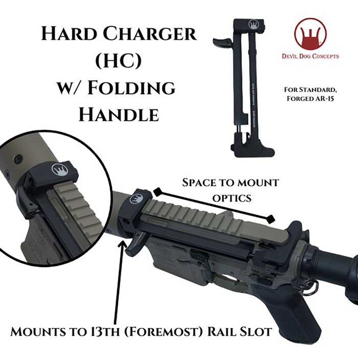 DEVIL DOG CONCEPTS HARD CHARGER SIDE CHARGING HANDLE W/FOLDING HANDLE for AR-15 er den perfekte løsningen for deg som ønsker å oppgradere ditt våpen uten å måtte bygge om eller kjøpe en ny rifle. Med Hard Charger® kan du enkelt konvertere riflen din til et side-ladingssystem.