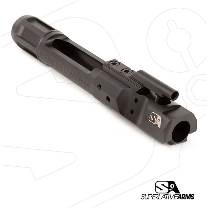 Superlative Arms bolt carrier er kompatibel med alle AR-15 bolter, og dette settet gir sluttbrukeren friheten til å velge sin egen bolt for å matche ønsket patron. Bolt carrier er laget av 8620 stål med en krombelagt bore (i henhold til mil spesifikasjoner) med forbedret maskinering og en overlegen DLC-belagt finish; som gir bedre smøring, mindre friksjon og enklere rengjøring.