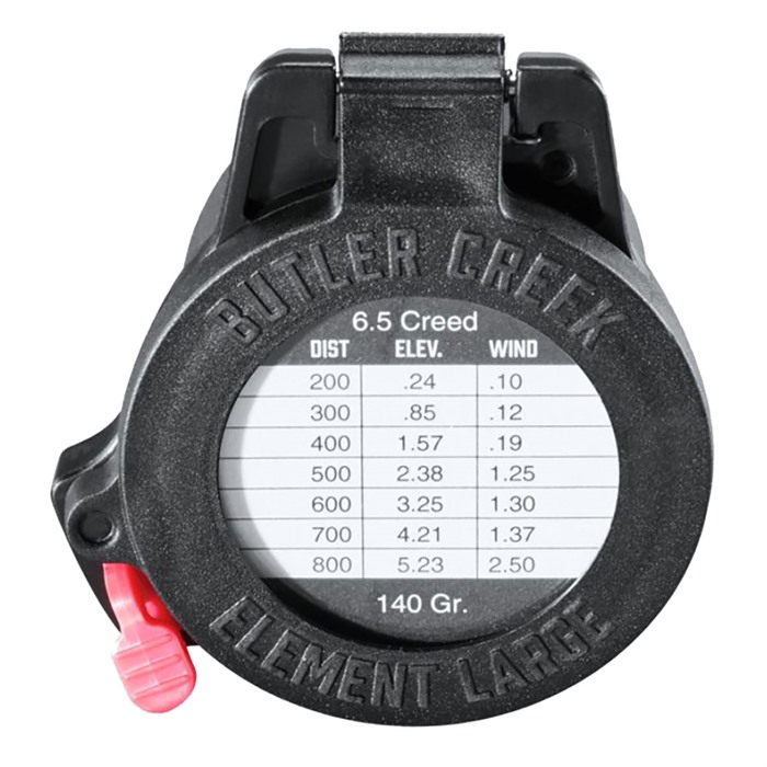051525000273 Butler Creek Element Scope Caps er svært robuste med et multifleksibelt deksel. Det utskiftbare dope-disken for objektivet gir informasjon om vind og høydejustering.Leveringstid ca. 14-21 dager.