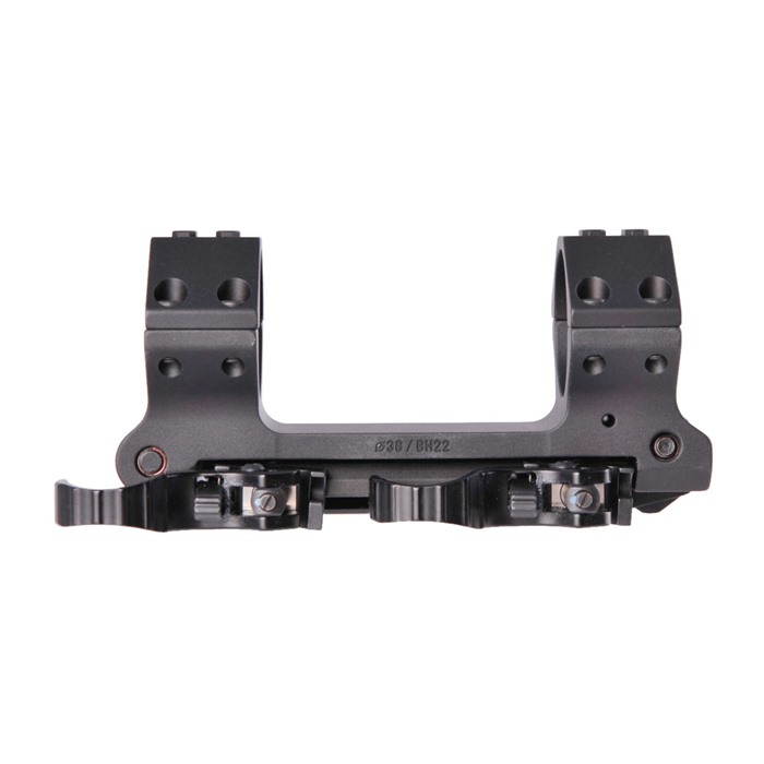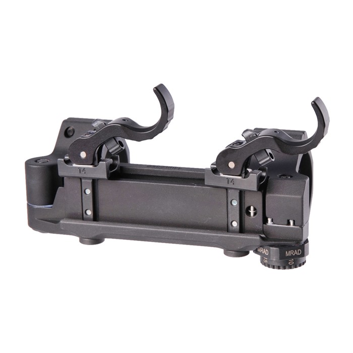 New GEN-2 with lightweight lever or nut system. Up to 7% lighter. Often the range of elevation adjustment of the scope in not the adequate to compensate for the bullet drop at long ranges. This scope mount was developed to offset the missing adjustment range of the scope. The inclination of the scope mount can be adjusted individually in steps of 10 from 0 – 70 MOA. The mount and the rifle scope can remain on the rifle. Self-locking thread inserts ensure permanent and stable seating of both bolted connections. Eratac guarantee 100% repeatability and shot strength. The upper and lower part of the mount are securely connected to each other by a screw running across the hand wheel diagonally. The hinge is designed as a solid tapered joint and ensures play-free seating of the components. NEW: The mount is now also supplied with a dial in mrad/MIL. The inclination can be changed in steps of 5 between 0 – 20 mrad/MIL. A Dozen Reasons for ERATAC Mounts: Machined from solid high-grade aluminum Hard anodized, matte black Made acc. to Mil-Spec. Type III Rust-proof components 100% repeatability Immediate return to zero! Tested up to cal. .50 BMG Available in many heights for different weapons and scopes With or without inclination for long-range shooting Rings with UNIVERSAL interface for attaching various tactical accessories Clamping system manufactured acc. to NATO-STANAG 4694, compatible with Mil-Std. 1913 Locking by either safety levers or hexagonal nuts without losable parts 100% made in Germany