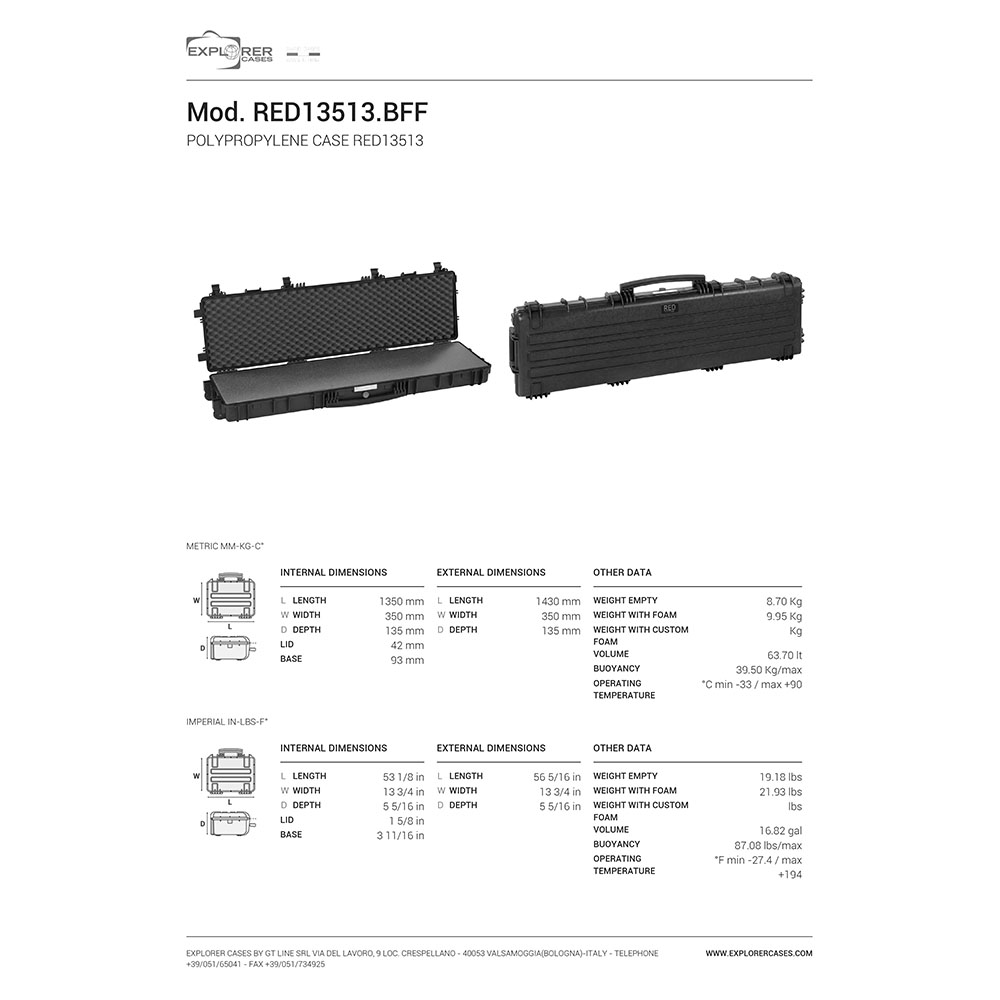 8024482183664 Den beste beskyttelsen for din mest dyrebare baby - Den ultimate våpenetuiet med en rekke funksjoner i høyeste kvalitet, produsert av Explorer Cases i Italia. Spesifikasjoner: Lengde: 1430mm (1350mm innvendig) Bredde: 350mm (350mm innvendig) Dybde: 135mm (135mm innvendig) Vekt: 9,95 kg (8,70 kg uten innlegg) Farge: Svart Innlegg: Tetthet Fullskum Bokstavelig talt uforgjengelig Våpenskuffene fra Explorer Vesker har korrosjonsbestandige metallhengsler med lokketrekk, som fester dekselet og holder det på plass når det åpnes. Så du kan være trygg på at våpensakene dine vil hjelpe deg lenge. Takket være låsesperrene er våpenskapene alltid høyt sikret. O-ringpakningen gjør dem også vanntette i stor grad. Hvert våpenskap er utstyrt med en manuell lufttrykkventil. Derfor kan du ta det med ro og ikke ha noe problem med å behandle og avslutte saken. Akkurat hvordan du vil ha det Etuiene er utstyrt med innvendige utskjæringer for valgfrie interne braketter eller monteringsringer, slik at du kan lagre alt akkurat som det passer best for dine behov. Hver eneste koffert kommer med en vanntett avtagbar etikett som du kan merke utstyret ditt eller lagre dataene dine. Vesken kan enten transporteres tradisjonelt via det store fronthåndtaket eller via valgfrie skulderstropper, som enkelt kan festes til hvilken som helst modell. Mod Red 13513-serien kan også brukes som trilleveske.Restordre. Sendes når kommer til lager. Leveringstid ca 14-30 dager fra lokalt lager.