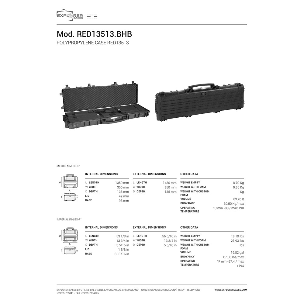 8024482182957 Den beste beskyttelsen for din mest dyrebare baby Det ultimate våpenetui med en rekke funksjoner i høyeste kvalitet, produsert av Explorer Cases i Italia. Spesifikasjoner: Lengde: 1430mm(1350mm innvendig) Bredde: 350mm(350mm innvendig) Dybde: 135mm(135mm innvendig) Vekt: 9,95kg (8,70kg uten innlegg) Farge : Svart Innlegg: inkl. 2 Gunbags Bokstavelig talt uforgjengelige Våpenkassene fra Explorer Cases har alle korrosjonssikre metallhengsler med lokkstag, som fester dekselet og holder det på plass når det åpnes. Så du kan være trygg på at våpenkassene dine vil hjelpe deg i lang tid. Takket være låselåsene er våpenkassene alltid svært sikret. O-ringpakningen gjør dem også vannavstøtende i stor grad. Hvert våpenhus er utstyrt med en manuell lufttrykkutløserventil. Derfor kan du ta det med ro og vil ikke ha noe problem med å håndtere og lukke saken. Nøyaktig slik du vil ha det. Koffertene er utstyrt med innvendige utskjæringer for valgfrie innvendige braketter eller monteringsringer, slik at du kan lagre alt akkurat slik det passer best for dine behov. Hver enkelt koffert kommer med en vanntett avtagbar etikett som du kan merke utstyret ditt med eller lagre dataene dine. Vesken kan enten transporteres tradisjonelt via det store fronthåndtaket eller via valgfrie skulderstropper, som enkelt kan festes til enhver modell. Mod Red 13513-serien kan også brukes som trillekoffert.Restordre. Sendes når kommer til lager. Leveringstid ca 14-30 dager fra lokalt lager.