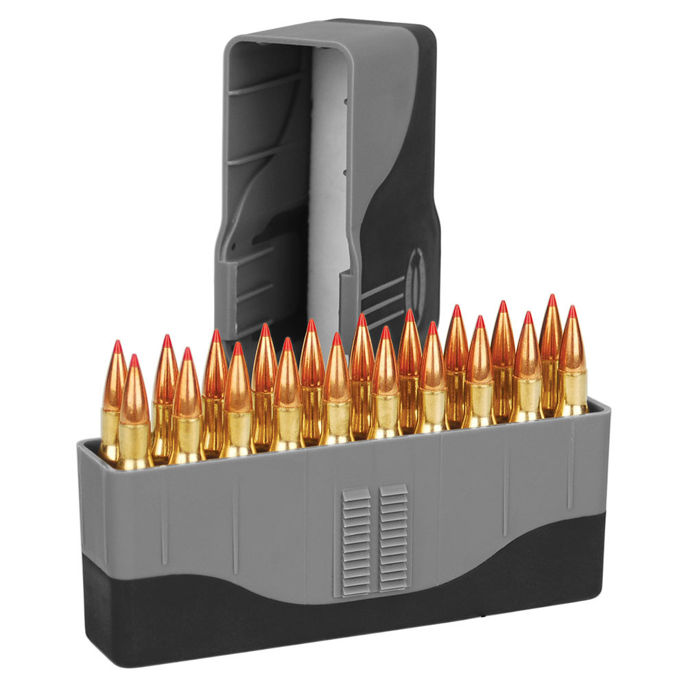 661120126102 Frankford Arsenal® Ammo Vault® tar oppbevaring og transport av ammunisjon til et helt nytt nivå. Ved å kombinere robuste, støtbestandige materialer og et innovativt låsesystem, tilbyr Ammo Vault® enestående beskyttelse for dine riflepatroner. Ingen flere klirring, ingen flere gummibånd, ingen flere sprukne og ødelagte bokser. Gi ammunisjonen din den beskyttelsen den fortjener. RLG-20 passer til belted mags, Lapua Mag, 45-70, osv.Fjernet fra programmet av produsenten