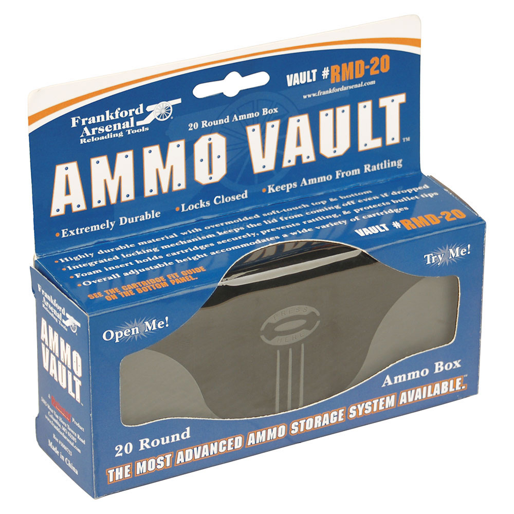 661120126003 Frankford Arsenal® Ammo Vault® tar oppbevaring og transport av ammunisjon til et helt nytt nivå. Ved å kombinere robuste, støtbestandige materialer med en innovativ låsemekanisme, tilbyr Ammo Vault® enestående beskyttelse for dine riflekartusjer. Ikke mer risting, ikke mer gummibånd, ikke flere sprukne og ødelagte esker. Gi ammunisjonen din den beskyttelsen den fortjener. RMD-20 passer til ammunisjon fra 222 Rem til 30-06.Fjernet fra programmet av produsenten