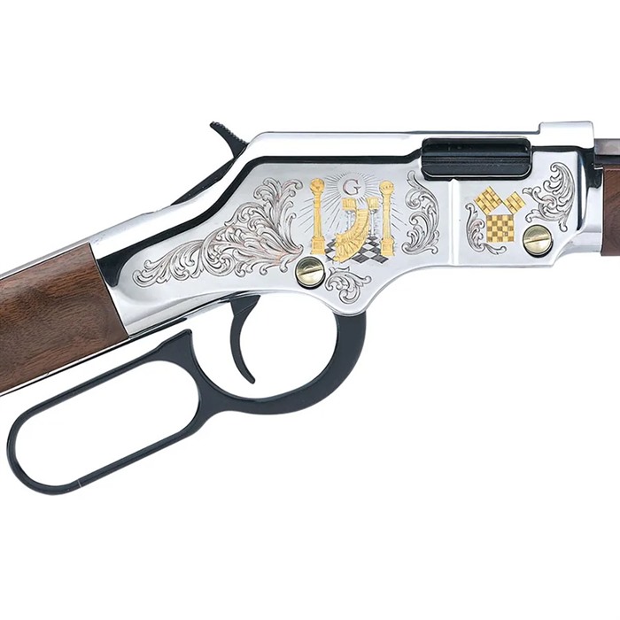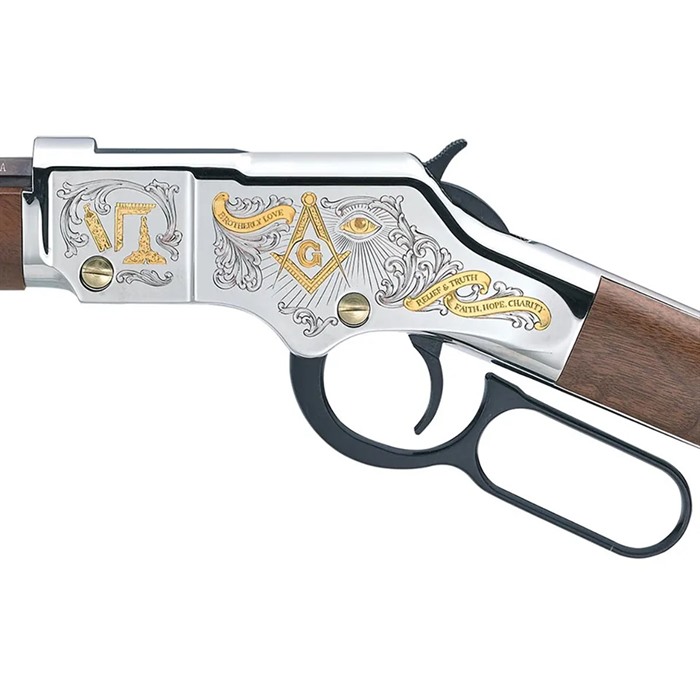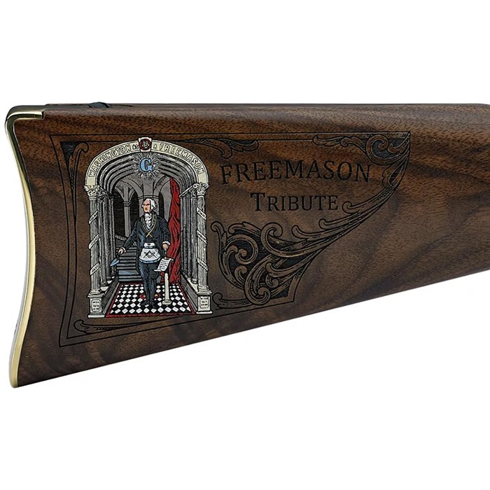 HENRY REPEATING ARMS GOLDEN BOY FREEMASONS TRIBUTE EDITION 22 LONG RIFLE LEVER ACTION RIFLE With roots dating back to the great European stonemason guilds of the 14th Century, the Freemasons later evolved into a fraternal order of brotherhood and service that spans the globe today. Each member is initiated into the order and progresses through the original medieval levels of advancement that include Apprentice, Journeyman (now called Fellowcraft), and Master Mason. Dedication to each other, and a belief in a supreme being (regardless of denomination), are essential elements that bind Freemasons together. The Masonic lodge serves as a meeting house, educational center for matters Masonic, and a setting for the rituals associated with the various functions of advancement, along with local internal Masonic business and social activities. Lodges and rituals typically display standard Masonic symbols familiar even to non-members, and those include both stone mason symbology as well as references to the Temple of Solomon. Freemasonry notes its beginnings here in America in the very early 1700s, with one of its most notable members being our first American president, George Washington. Open to all levels of society from cab driver to Congress, the Freemasons have included such names as country western singers Roy Acuff and Eddy Arnold, astronaut Buzz Aldrin, South Pole discoverer Roald Amundsen, hotelman John Jacob Astor, western star Gene Autry, comedian Richard Pryor, actor John Wayne, magician Harry Houdini, jazz legend Count Basie, America’s literary icon Mark Twain, and boxing great Sugar Ray Robinson, to name just a few. Henry is delighted to recognize this ancient and honorable fraternal order with their new Henry Golden Boy Freemasons Tribute Edition in .22 LR rimfire, proudly featuring imagery instantly recognizable by Masons everywhere on its brightly polished silver receiver. To further set off this striking tribute edition, the select American walnut stock depicts our first President in full Masonic regalia, with apron, trowel, and Warden’s column, standing on a “temple” floor in front of the Masonic staircase, in a painted tableau bordered by scrollwork in the same style as the receiver. What better way to acknowledge the order’s long history, and reward the work and dedication you, or someone important to you, has invested in Freemasonry. SPECIFICATIONS: Caliber: 22 L/LR/S Capacity: 16 Rounds Barrel Length: 20" Barrel Type: Octagon Blued Steel Rate of Twist: 1:16 Overall Length: 38.5" Weight: 6.75 lbs. Receiver Finish: Nickel Plated Rear Sight: Fully Adj. Semi-Buckhorn w/ Diamond Insert Front Sight: Brass Bead Scopeability: Drilled and Tapped Scope Mount Type: GB-CSM Stock Material: American Walnut Buttplate/Pad: Brass Length of Pull: 14" Safety: 1/4 Cock Best Uses: Target/Hunting/Collector Embellishments/Extras: Receiver Engraving with 24K Gold Plating. Engraved/Painted Stock