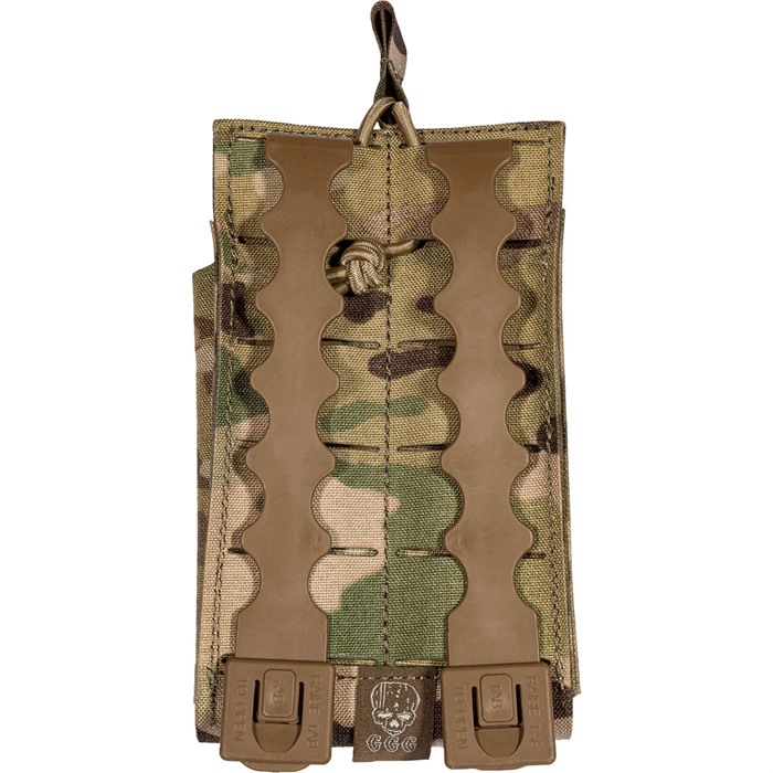 810001172718 Grey Ghost Gear sin Single 7.62 Mag Pouch er konstruert av laser kutte laminert nylon, noe som betyr at den er lettere og mer strømlinjeformet enn noensinne! Den holder sikkert ett tjue rounds 7.62x51 NATO (.308) magasin. Ideell for SCAR Heavy, M-14, HK-91, FN FAL eller de fleste andre 20 rounds 7.62 rifle magasiner. Den har et åpent toppdesign med en justerbar bungee festestropp som gjør det mulig å fjerne magasinet stille, samt modulær webbing foran og bak for å tillate stabling av andre lommer. Fester seg til enhver MOLLE/PALS stil webbing med to medfølgende korte MALICE CLIPS®. Tilgjengelig i MultiCam®, Coyote Brown og Black. Magasin ikke inkludert. Mål: 4" x 4" x 1"Leveringstid ca. 14-21 dager.