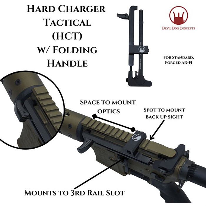 DEVIL DOG CONCEPTS HARD CHARGER TACTICAL SIDE-CHARGING HANDLE W/FOLDING HANDLE FOR AR-15 er det perfekte tilbehøret for å oppgradere ditt AR-15. Med Hard Charger® Tactical med sammenleggbart håndtak, kan du enkelt konvertere riflen din til en side-lader uten å måtte bygge om eller modifisere den.
