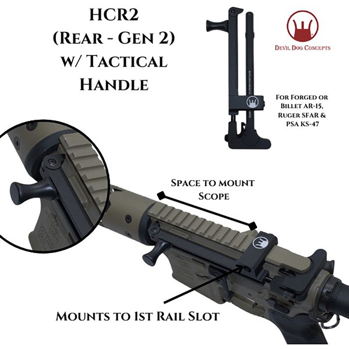 DEVIL DOG CONCEPTS HCR2 G2 HARD CHARGER REAR SIDE CHARGING HANDLE W/TACTICAL PULLING HANDLE FOR AR-15 HCR2 (Hard Charger® Rear – Gen 2) med taktisk håndtak: for AR-15 Forged/Billet, SFAR & KS-47. Nå trenger du ikke å bygge om din upper receiver eller kjøpe et nytt våpen for å få side lading!