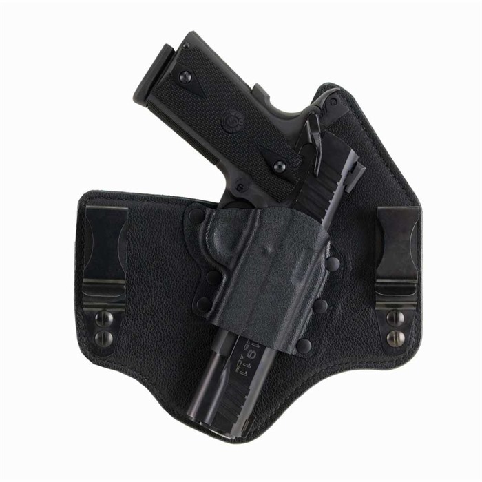 SPECS: Leather backing panel and outer shell, Kydex holster pocket, black. Spring steel belt clips, blued. Fits belts up to 1.75” wide.