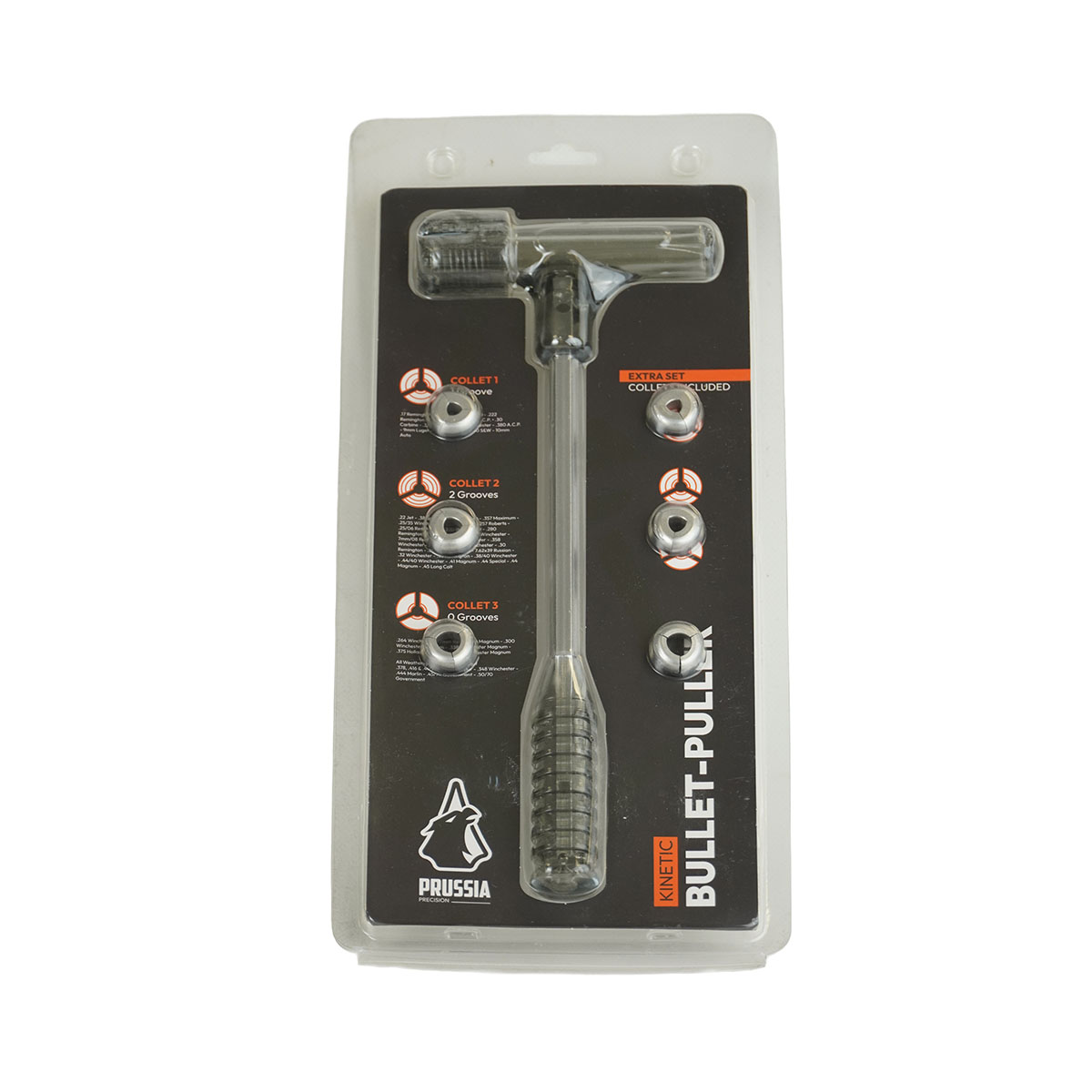 726529840698 The Prussia Precision Bullet Puller is perfect for when you need to pull some bullets. This impact-style tool method makes pulling bullets easy. Just one stern “whack” and the bullet is separated from the brass it’s as easy as that. Three different collets are included, allowing you to pull bullets from just about every caliber from .22 Hornet to .45-70, whether rimmed or rimless. Please note: This is blem Product, the packaging may have slight print imperfections, but the product itself is absolutely flawless in quality and performance.Leveringstid ca. 7-10 dager.