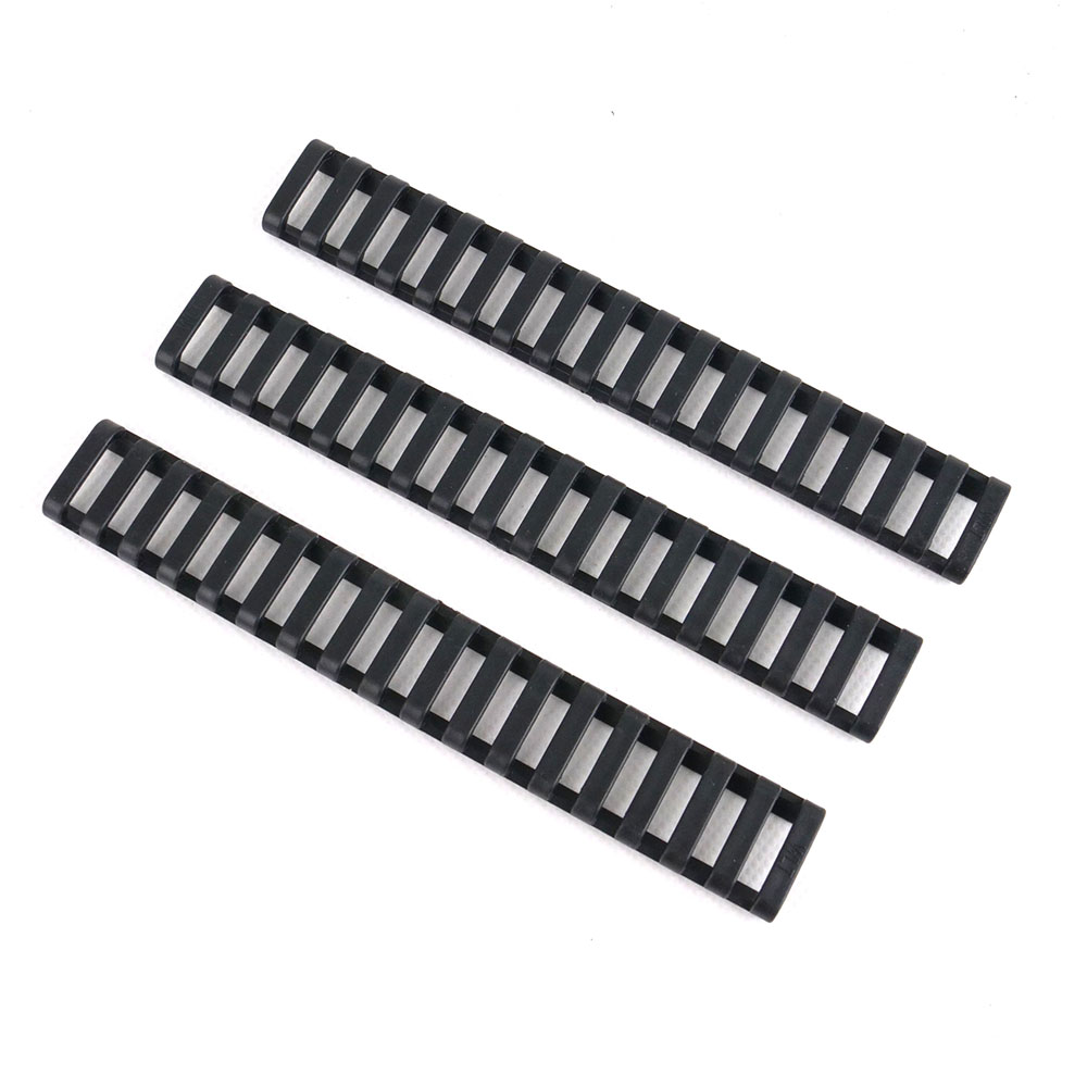 Ladder Picatinny Rail Cover 18-SLOT gir en strømlinjeformet og lavprofilert dekning for dine 1913 Picatinny-skinner. Denne pakken inneholder tre 17,8 cm lange paneler i stigeform, som gir rikelig dekning for et standard quad rail-system.