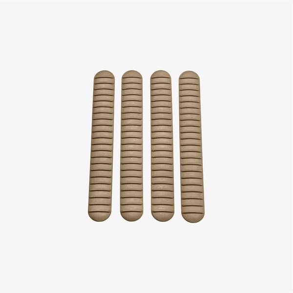A low-profile M-LOK® Rail Cover designed to fit most machined rails and polymer handguards. The soft no slip material and ribbing provides a sure grip, providing extra traction and heat resistance. FEATURES Press-In Fit. Each Rail Cover fills 3 M-LOK® sections. Manufactured from heat and chemical resistant material. Available in all standard colors. Sold in packs of 4. SPECS Weight: 0.15 oz. Length: 4.6 in. Width: 0.62 in.