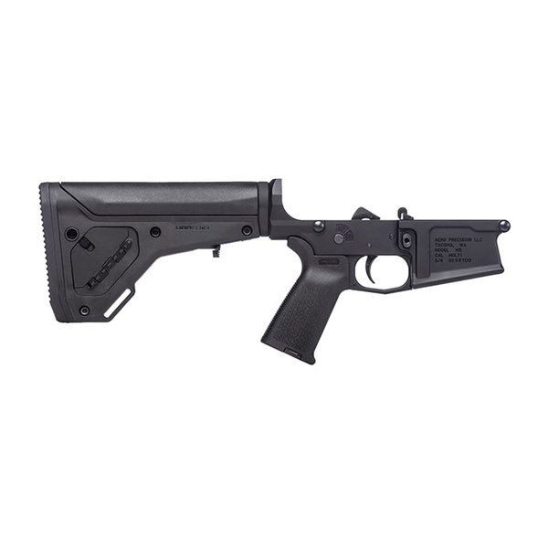 The M5 Complete Lower Receiver is the perfect base for your custom big-bore AR build. This complete lower features Aero's custom designed M5 Lower Receiver and is upgraded to include a MOE® Grip and UBR® Gen2 Collabsible Stock. Includes: M5 Stripped Lower Receiver MOE® Grip UBR® Gen2 Collabsible Stock Lower Parts Kit Integrated UBR Custom Receiver Extension Tube M5 Carbine Buffer and Spring These parts are installed Aero's M5 Lower Receiver sets the standard for big-bore AR builds. This custom designed enhanced forging is machined from 7075-T6 Aluminum and works with standard AR308 components and magazines. It has been engineered with upgraded features, including a threaded bolt catch roll pin, integrated trigger guard, upper tension screw, threaded takedown pin detent recess and increased magwell flare. It uses custom takedown and pivot pins as well as an extended magazine catch button which are included in this assembly.