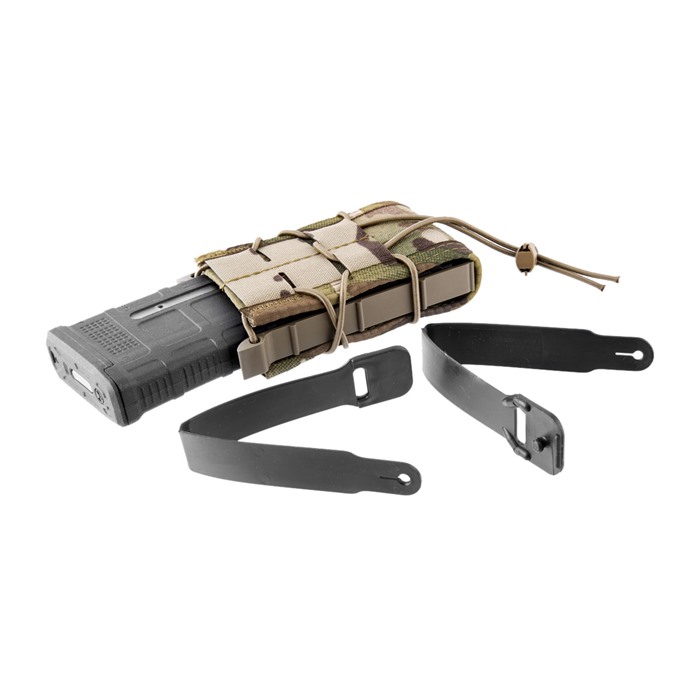 High Speed Gear’s TACO Rifle Molle mounted magazine carrier uses injection molded polymer sides, Cordura™ front and back, and shock cord lacing to lock just about any rifle magazine into place. USGI, HK, PMAG, ARC, FAL, AK 30/ 40, LR20 and M14 magazines are all held securely and deployed easily and silently on demand. The TACO® Rifle magazine carrier even works for certain radios, flash bangs and smoke grenades and provides this versatility while taking up only 3” horizontal inches on your mounting platform. The pouch maintains a positive, adjustable grip on its contents without additional securing systems. However, if additional retention is desired webbing tabs are sewn in on the top for use of "over the top" bungee retainers and loop Velcro is sewn on the interior if the users wishes to use adhesive hook on the magazine.