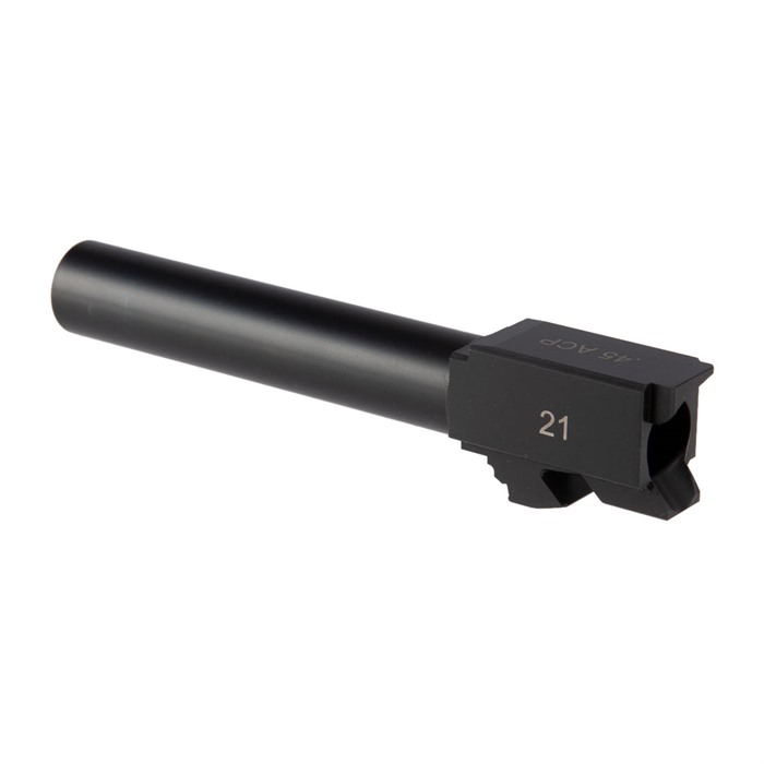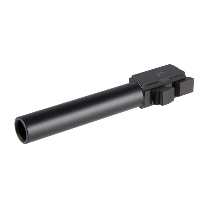 Our Match-Grade Barrel for the Glock® 21 is a premium barrel machined from hardened 416R stainless steel to precise dimensions, so it delivers a tight lockup that helps ensure superb accuracy. It's a drop-in fit to most guns, too. And the extra-hard Black Nitride finish resists surface wear and stops in its tracks whatever corrosion might try to challenge the stainless steel. This .45 ACP chambered barrel is button-rifled with standard, 1-10" right-hand, 6-groove rifling that is compatible with the non-jacketed bullets of inexpensive "practice" ammo. You can get your match barrel for Glock® 21 with either a Plain muzzle or Threaded (.578"-28 tpi) to enable installation of a compensator or sound suppressor. Both have an 11-degree target crown, and each is laser engraved with the chambering and the Glock® model it fits. Fits Glock® 21 Hardened 416R stainless steel Non-reflective Black Nitride anti-corrosion finish Chambered in .45 ACP Button-rifled, 6-grooves, 1-10" twist Available with .578"-28 tpi threaded muzzle A Match-Grade Barrel for your Glock® 21 from Brownells is an excellent replacement for a shot-out factory barrel, and it's the ideal tube for a custom gun built on a Polymer80 PF45 frame!