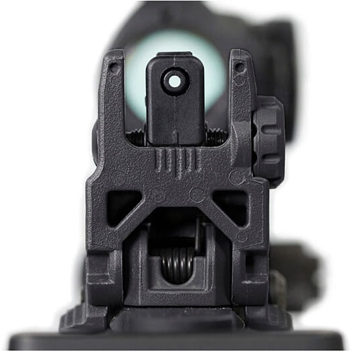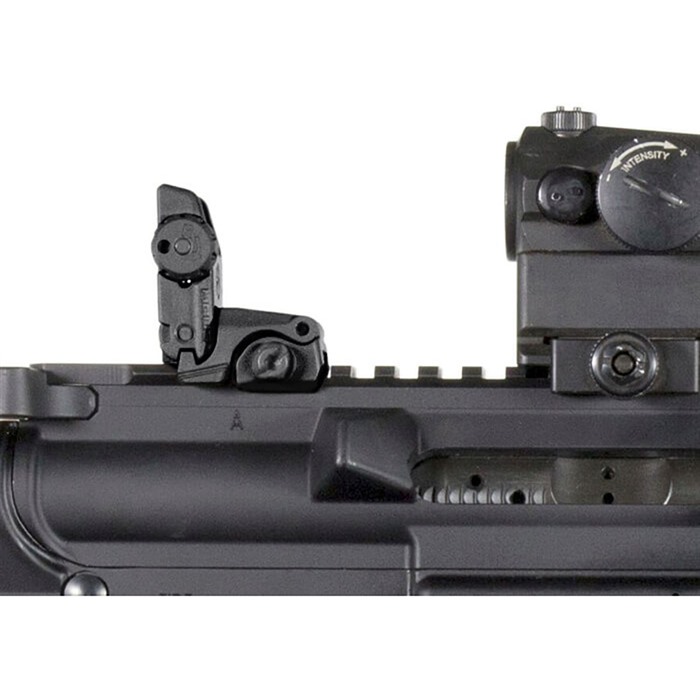 873750004358 Lavprofil, flattop-monterte polymer-sikter utfolder seg umiddelbart ved berøring av en finger for å gi backup-sikting hvis en primær optikk svikter. Strømlinjeformede konturer betyr at det ikke er noe å hekte seg fast i busk, slynge eller annet utstyr når de er foldet. Fjærbelastet ambidextrous utløsningsmekanisme lar deg trykke på den rillede fanen på begge sider av siktet for å utføre og låse det på plass. Å trykke på de samme fanene trekker siktet tilbake når du er ferdig. Bruker mindre enn 1" av MIL-STD 1913 Picatinny mottaker skinneplass og låser sikkert på plass med den medfølgende stål tverrbulten. Gir samme høyde over løpet som standard A2 jernsikter. Vindjusterbart bakre sikte har to hull: et stort, 0,185" kikkhull og et 0,070" kikkhull. Designet for AR-type rifler og karabiner, passer til ethvert våpen med Picatinny-skinner.Leveringstid ca. 14-21 dager.