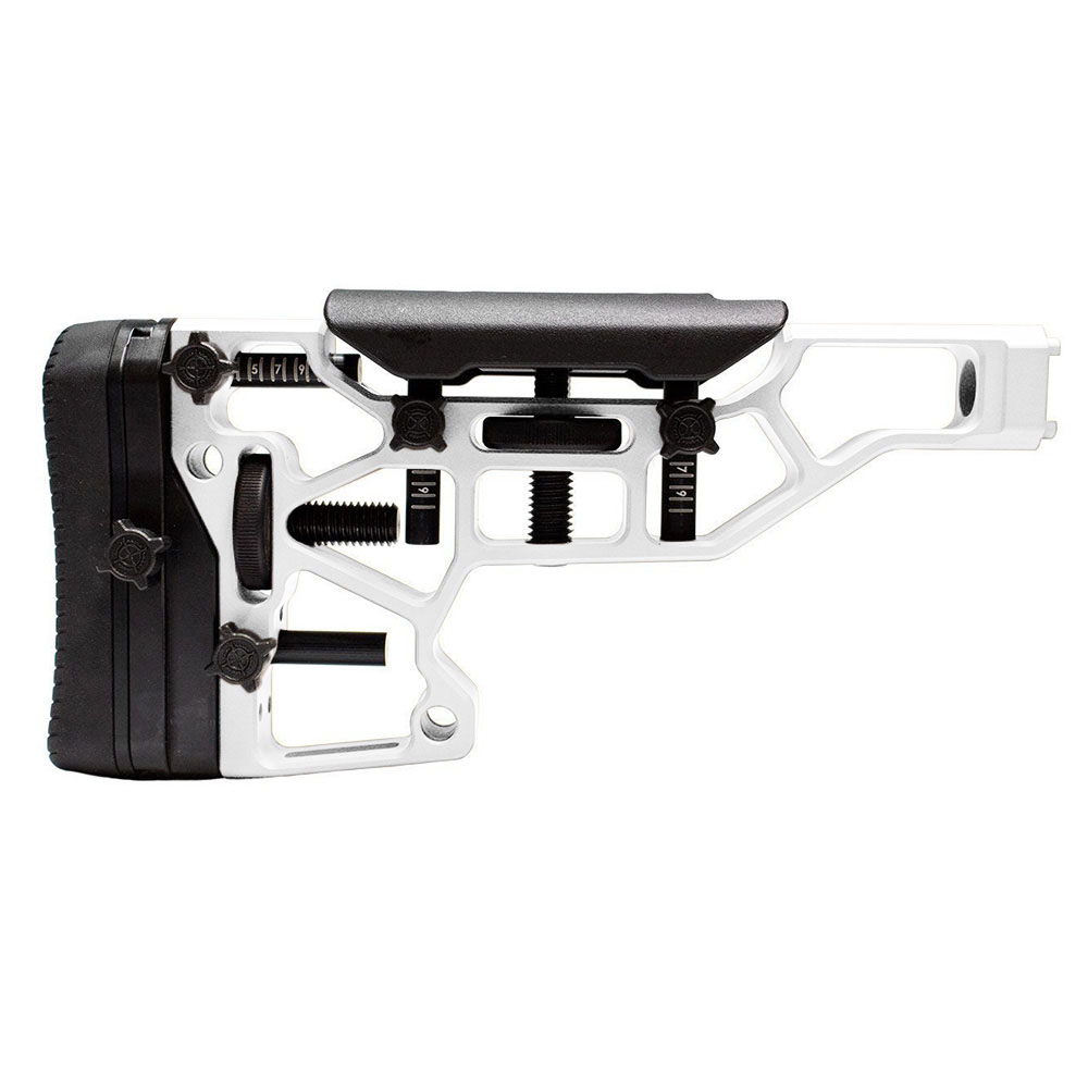 Toolless adjustment of the MDT Skeleton Rifle Stock elevates the comfort and performance of the shooter. Horizontal, vertical and cant adjustment to the cheek riser and buttpad ensures a perfect fit for your shooting position. Elite has a steel buttplate and two etched guide rods. Fits ACC and ESS chassises (XTN interface).