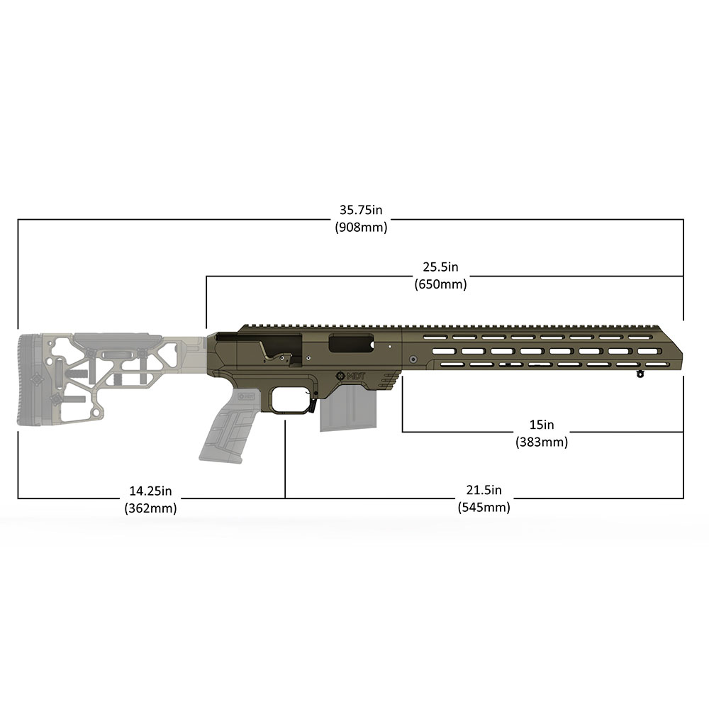 MDT TAC21 Gen 2 Chassis System er designet for å gi deg enestående presisjon og ergonomi. Dette systemet bruker AICS-type magasiner og AR-type pistolgrep, samt mottakerforlengelser/buffer rør og kolber (selges separat).