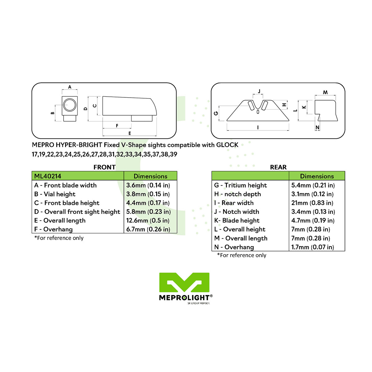 MEPRO HYPER-BRIGHT V-SIGHT FIXED SETS og MEPRO HYPER-BRIGHT GLOCK STANDAND FRAME - O RING er verdens lyseste håndvåpenkikkert i alle lysforhold, med tritium som er spesialformulert for å gi deg bransjens første strålende lysstyrke fra dagslys til midnatt.