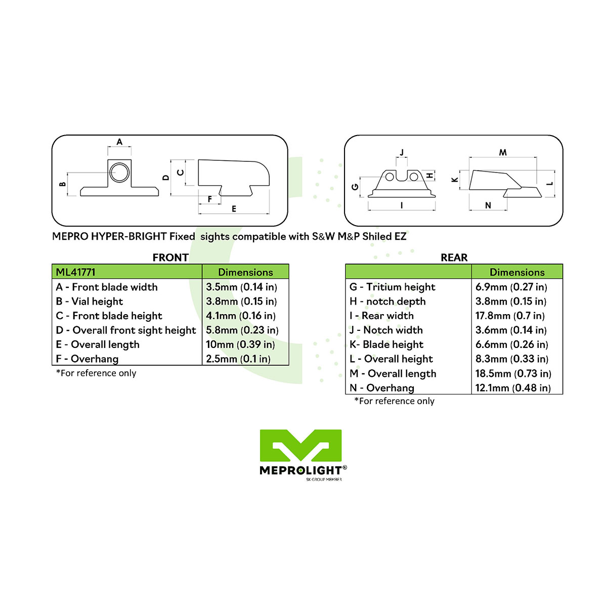 Mepro HYPER-BRIGHT faste dag- og nattsikter gir den mest pålitelige belysningen, både dag og natt. De faste siktene har en ekstremt lyssterk kontrastfarget ring for rask og nøyaktig måloppnåelse i dagslys. Både bak- og framsikter vil fremstå grønne under lavlys- og mørke forhold, noe som gir maksimal trygghet i evnen til å treffe når det gjelder.