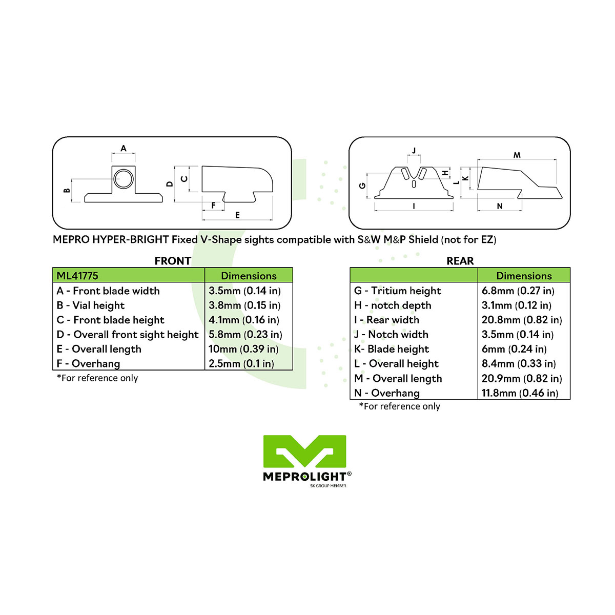 MEPRO HYPER-BRIGHT V-SIGHT FIXED SETS, MEPRO HYPER-BRIGHT V-SIGHT S&W M&P SHIELD (NON-EZ MODELS) - O RING er verdens lyseste handgun-sikte under alle lysforhold.