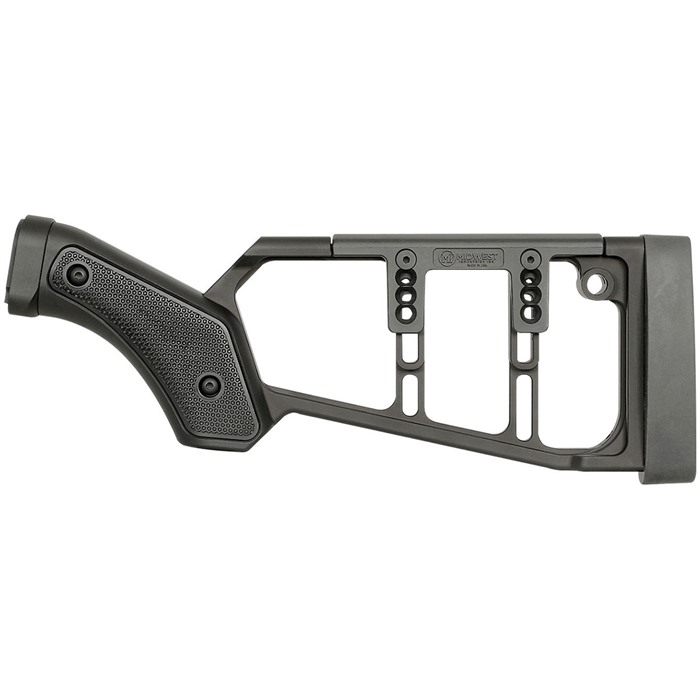SHOTGUN STOCK FOR MOSSBERG 590 FEATURES: Compatible with Mossberg 590 Shotguns Polymer cheek piece provides adjustability for use with iron sights, red dots, or magnified optics Cheek piece in the lowest position maintains the same height as the factory stock Maintains factory length of pull. Spacer plates are an available add-on if a longer length is needed. Ambidextrous design works for left and right-hand shooters Exclusive Midwest Industries butt pad reduces felt recoil while maintaining a secure fit in your shoulder Features several properly placed anti-rotation QD swivel sockets. Also incorporates one standard sling swivel location and stud for versatile sling placement. MI-designed grip panels give a unique look while providing ample texture in a rainy or snowy environment M-LOK® compatible slots on either side for use with MI Universal Shell Holders or M-LOK® panels for aesthetics Provides factory length of pull to fit most users Grip and stock beam made from Hard Coat Anodized 6061 Aluminum Weight of Complete Unit: 1lb 11oz Made in the USA Lifetime warranty