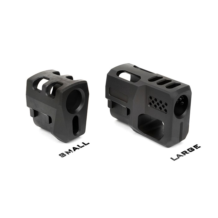 Kompenseren for Strike Modular Chassis (SMC) har et sømløst design som kan monteres direkte på chassiset, tilgjengelig i to lengdealternativer: liten og stor. Den er nødvendig for SMC-oppsettet med en SIG SAUER P320 3.9” sklie/løp. Ingen gjengeet løp er nødvendig, noe som eliminerer behovet for å kjøpe et ekstra løp hvis du ikke har det, og holder oppsettet ditt lovlig i alle 50 stater. Den utvidede bore er designet for å redusere baffelstreik og nøkkelhull-runder. Ingen permanent modifikasjon av våpenet ditt er nødvendig, noe som gjør installasjonen enkel. Bare én (x1) tommelskrue er nødvendig for å installere eller fjerne SMC-kompensatoren.