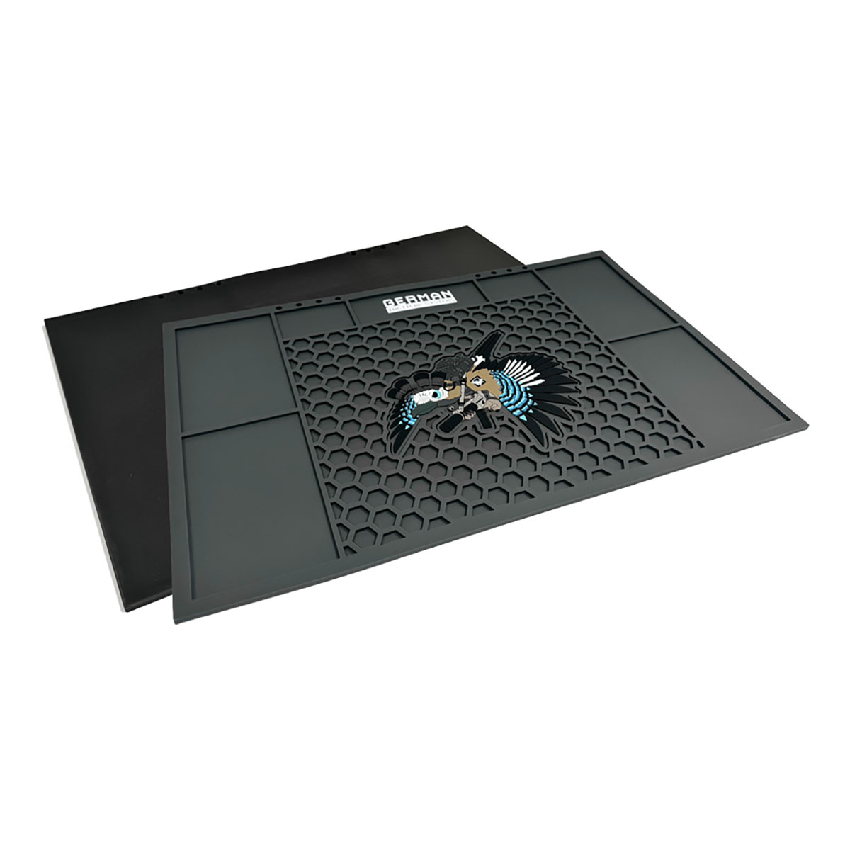 Vedlikeholdsmatten – Pistol er designet for seriøs våpenpleie, enten du rengjør pistoler, revolvere eller andre kompakte skytevåpen. Laget av slitesterk PVC og med praktiske oppgraderinger, holder den verktøyene dine organisert og arbeidsplassen ren, samtidig som den stolt viser Eurasian Jay, maskoten til German Tactical Systems.