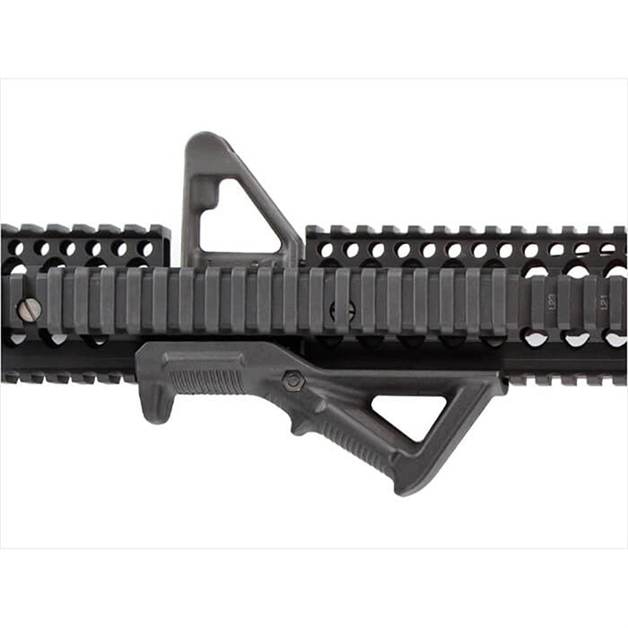 Low-profile forward grip/hand stop takes advantage of natural body mechanics to give the shooter more precise control, faster pointing, and less operator fatigue. The Magpul AFG™ (Angled Fore-Grip) positions the support hand close to the centerline of the bore for maximum recoil control to aid in fast, accurate follow-up shots. Provides a consistent reference point for finding the correct hand position quickly when mounting the weapon under stress. The natural, ergonomic hand position with the palm facing up results in better blood flow than the “clenched fist” stance often used with vertical grips that leads to fatigue and loss of sensation during long periods in the ready position. Improves on the “thumb break” hold often used with standard vertical grips by allowing the thumb to rest comfortably alongside the top rail, pointing forward, with the rest of the hand in full contact with the forend. Heavy-duty reinforced molded polymer construction stands up to the hard knocks of tactical operations, and deep, molded-in grooves help you maintain a firm grip even with wet hands. Interchangeable inserts give the choice of a straight, uninterrupted gripping surface or one with a convenient ledge to support the index finger. Slides over any Picatinny-style rail and locks securely in place with a hardened steel crossbolt. The original AFG1™ provides a large grasping surface and covers approximately 5½" of rail.