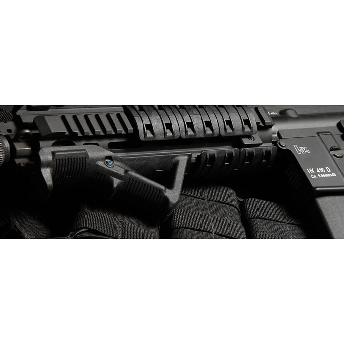Bygget i kraftig forsterket støpt polymer, tåler den harde påkjenninger fra taktiske operasjoner, og dype, støpte spor hjelper deg å opprettholde et fast grep selv med våte hender. Interchangeable inserts gir valget mellom en rett, uavbrutt gripflate eller en med en praktisk kant for å støtte pekefingeren. Den glir over hvilken som helst Picatinny-type skinne og låser seg sikkert på plass med en herdet stål kryssbolt.