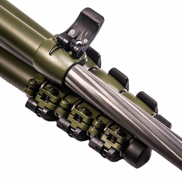 Midtsøylen kan rotere fullt 365°. Dette er en flott funksjon for de som har til hensikt å montere en PIG Saddle eller HOG Saddle direkte. Tripodens føtter har utskiftbare gummiføtter eller spikerføtter (spikerføtter er inkludert). PIGlite-CF4 Carbon Fiber Tripod har en robust vektvurdering på 24 lbs og er ferdig i flat OD Green maling.