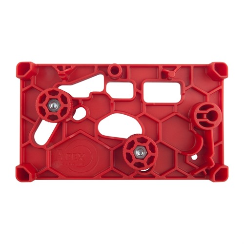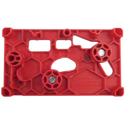 Tooling Plate er designet for å festes direkte til undersiden av Apex Polymer Armorer's Block, og gir en hevet overflate for arbeid med M&P og Glock-pistoler. Tooling-platen har snap-låser og spor for å holde 1/8" tilpasset rullpinne-punch og 1/16" allen-nøkkel. Gummiføtter griper arbeidsflaten, noe som gir et solid grep under arbeid. En ringmagnet på undersiden av platen vil forhindre at magnetiske deler slipper unna.