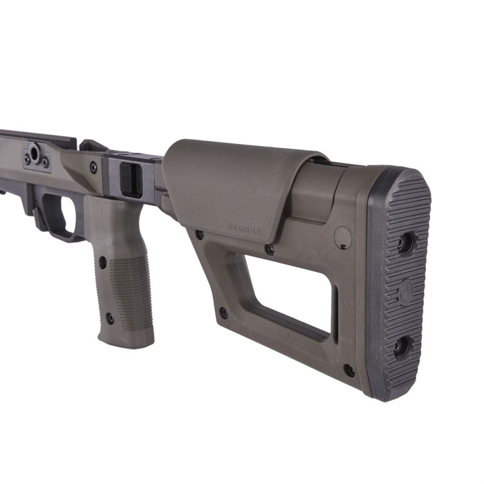 Maintaining the most important features of Magpul’s original Pro 700L, the Pro 700L Lite strikes a balance between features and cost without sacrificing performance. As the name suggests, the Pro 700L Lite blends the original Pro 700L Chassis and the PRS Lite stock to create a simplified rear end with a strong foundation – passing on the value and weight savings to you. The streamlined design weighs in at 4.5 pounds, a full pound less than its predecessor, but still packs a complete set of features that elevate your rifle’s performance. The Pro 700L Lite provides an optimized shooter interface with 0.8” of comb height and 1.4” of LOP adjustments (LOP measures 13.0” -14.4”). The low-profile rubber butt-pad is adjustable for height and cant, providing an extremely stable interface with the shooter’s shoulder. Sling attachment options include an ambidextrous 1.25” footman’s loop, a reversible QD sling swivel cup, and space for another optional QD sling swivel cup. The injection-molded polymer grip has a 5-degree forward edge sweep and enlarged palm swell with a 7-degree aft edge sweep for enhanced user comfort, and it includes a .75” fore/ aft adjustment range using a common hex wrench. An additional grip is included, offering a more aggressive sweep and enlarged palm swell for the shooter who is more inclined to a less vertical grip interface (8-degree forward / 20-degree aft edge sweep). The Pro 700L Lite surrounds its billet-aluminum chassis with Magpul polymer for enhanced ergonomics, strength, and sound mitigation. Built around the user, it is fully ambidextrous at the swap of a bolt retainer plate, and the vertical grip can be adjusted for various trigger reaches. The included large trigger guard can accommodate usage with gloves and aftermarket triggers. The AICS-pattern magazine well features an ambidextrous mag release and has a front barricade stop to prevent the rifle from resting on the magazine when using barricade support. Up front, there are numerous M-LOK slots (left-6 / right-6 / bottom-7) allowing you to mount whatever accessories your loadout calls for. Extremely versatile and adaptable, the Pro 700L Lite turns your long action, 700-pattern rifle into the perfect bolt action precision machine. FEATURES Fully machined aluminum fore end and bedding block AICS compatible bottom metal Vertical grip with adjustment for trigger reach Large trigger guard accommodates gloves and aftermarket triggers Compatible with left and right-handed actions Comb height, LOP, and butt pad adjustment from PRS Lite Injection-molded polymer grip with 5-degree forward edge sweep and enlarged palm swell with 7-degree aft edge sweep for enhanced user comfort combined with a .75” fore/aft adjustment range using a common hex wrench Additional grip option included with a more aggressive sweep and enlarged palm swell for the shooter that is more inclined to a less vertical grip interface (8 degree forward / 20-degree aft edge sweep) Multiple sling attachment points (an ambidextrous 1.25” footman’s loop, a reversible QD sling swivel cup, and a space for another optional QD sling swivel cup Made in the USA COMPATIBILITY Compatible with Remington® 700 Long Action and other Remington 700 Long Action footprints. Buttstock/cheek riser must be removed on the Pro 700L Lite before the user can remove the bolt from the action. Ships with MAG698 (Magnum Long Action AICS 5-round PMAG)