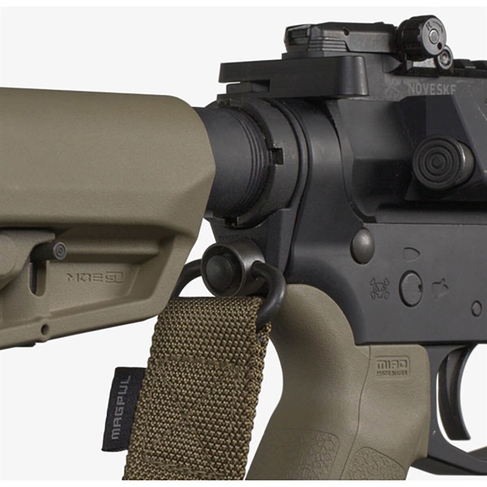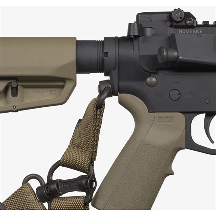 873750011844 Ambidextrous sling festepunkt for hurtig-avtakbare swiveler legger til en sentralt plassert kontaktpunkt bak på mottakeren. Mer enn 180° sling bevegelse gjør det mulig for både venstre- og høyrehendte skyttere å raskt skifte våpen mellom skuldrene, pluss at monteringskoppen er vinklet litt nedover for større bevegelsesfrihet og for å skape et ferdig utseende. Lavprofil design inkluderer avrundede kanter som minimerer fastkjøring. Konstruert av slitesterk, herdet, presisjonsstøpt stål med en Melonite™ finish for ekstrem motstand mot slitasje og korrosjon. For å installere, fjern den standard AR-15/M4 karabin stokk mottaker end plate og skyv på ASAP-QD. Fungerer med en-punkts type slings med push-button QD kontakter, som Magpul's MS4® Dual QD GEN 2 Sling, samt MS1® Multi-Mission Sling med en QD sløyfe montert bak. Slings selges separat.Leveringstid ca. 14-21 dager.