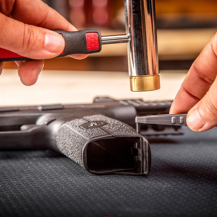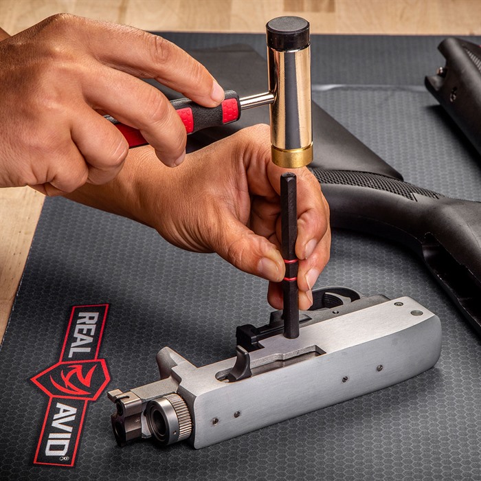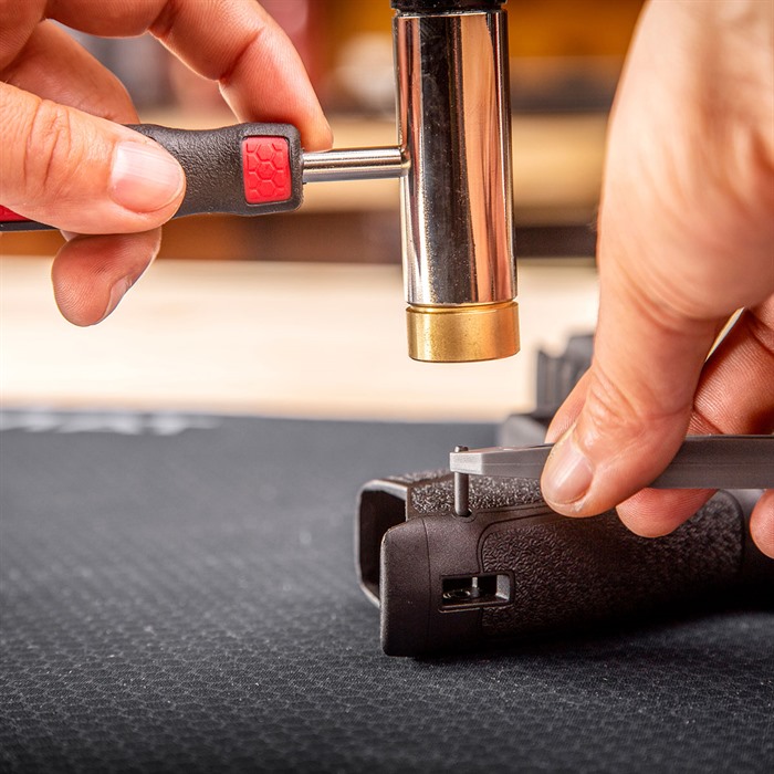 STANDARD BRASS & STEEL PIN PUNCH SET – GUNSMITHING PIN PUNCH SET MED PIN ALIGNMENT TOOL. Dette avanserte settet fungerer for å fjerne og installere våpenpinner på en sikker måte. Den ergonomiske og perfekt balanserte hammeren samarbeider med Easy-Grip™ hex-håndtakspunchene for presis kontroll.