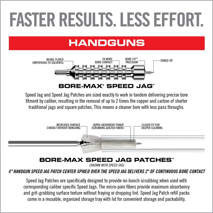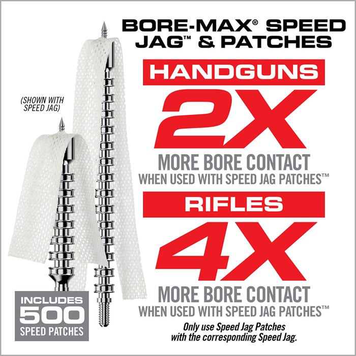 Speed Jags og Speed Jag Patches er dimensjonert for presis borepassform og optimal rengjøring. Den 4X større borekontakten gir en renere bore raskere, noe som gir mer tid på skytebanen.