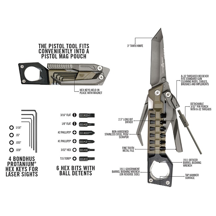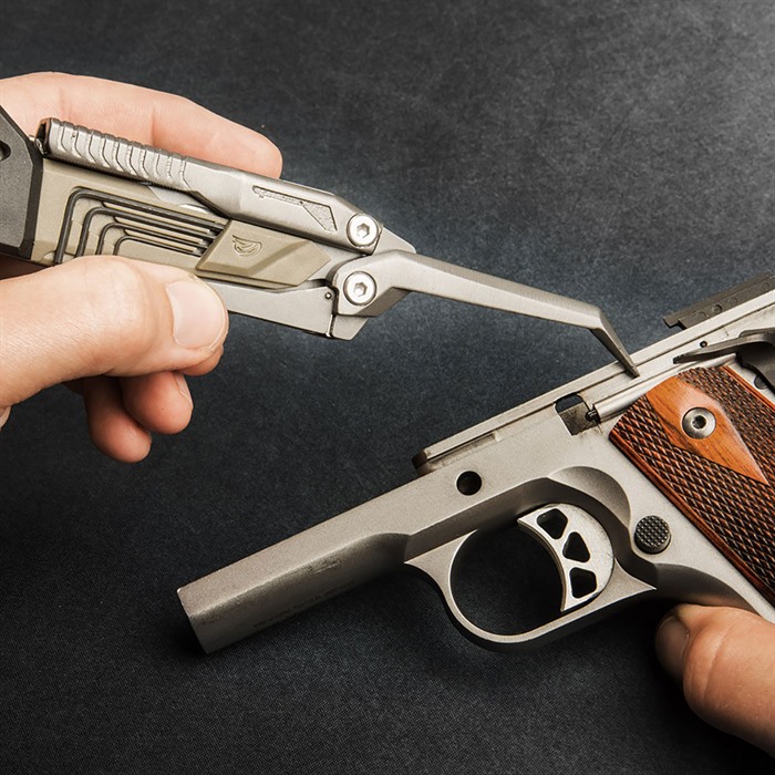 Mai aldri før har så mye innsikt vært bygget inn i et verktøy som kan passe i din magasinlomme. Pistol Tool gir skyttere muligheten til å vedlikeholde, legge til tilbehør og justere sin favorittpistol med enkel tilgang til 19 presisjonsverktøy.