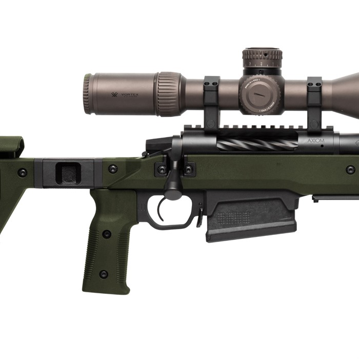 Integrert AICS mønster magasinbrønn av forsterket polymerkonstruksjon optimalisert for PMAG® 5 AC™ L, Standard og PMAG® 5 AC™ L, Magnum - AICS Long Action magasiner samt de fleste andre AICS mønster lang aksjon magasiner. Stort avtrekkerbeskyttelse tillater bruk med hansker og aksepterer de fleste fabrikk og ettermarkedet buede eller flate avtrekkere.