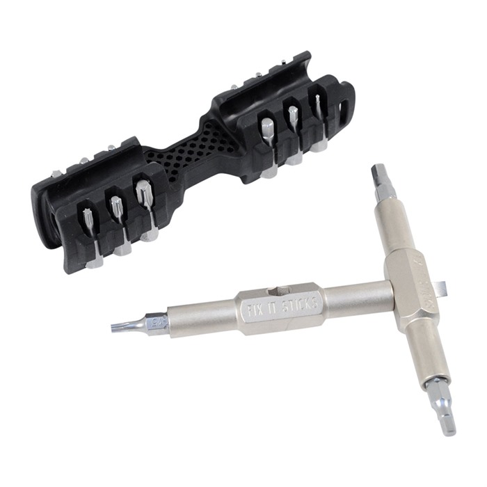898207002343 Fix It Sticks Replaceable Edition for skyting / jakt tilbyr enestående bærbarhet, funksjonalitet og allsidighet. To Fix It Sticks (som kombineres for å danne et T-håndtak) og 16 bits holdes i en støpt brakett for bærbarhet / lagring. Ekstra plass i hver ende kan romme to ekstra bits. Inkluderer følgende bits: 2,5 mm hex, 3 mm hex, 4 mm hex, 5 mm hex, T-10, T-15, T-20, T-25, T-30, 1/8" hex, 5/64" hex, 3/32" hex, 5/32" hex, 3/16" hex, Slotted #5, Phillips #1. Høy kvalitet stål konstruksjon (kan motstå 40Nm med dreiemoment). Kompakt, holdbar og aksepterer enhver standard 1/4" bit.Restordre. Sendes når kommer til lager. Leveringstid ca 4-12 uker fra USA lager.