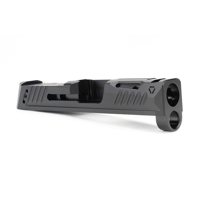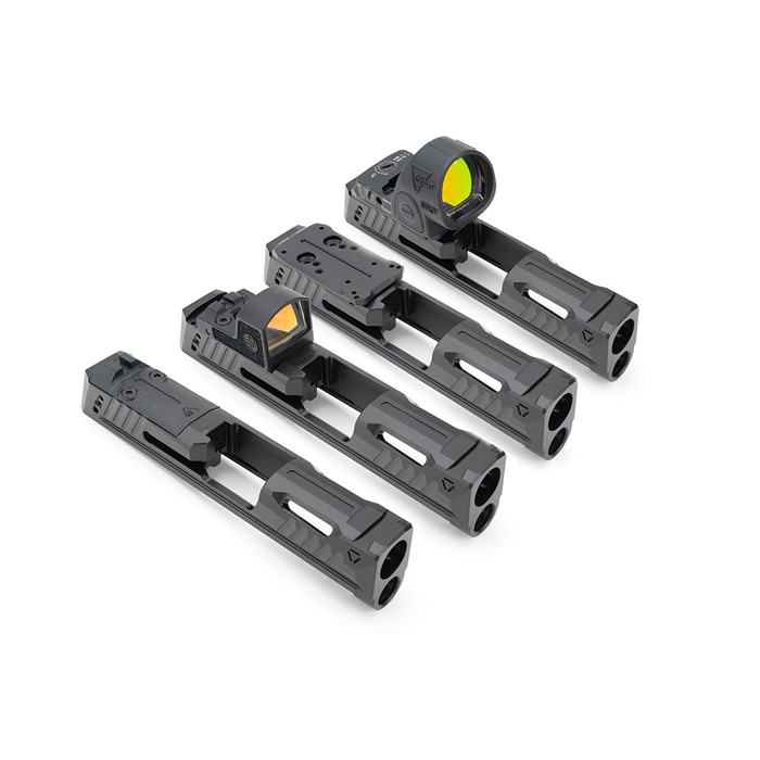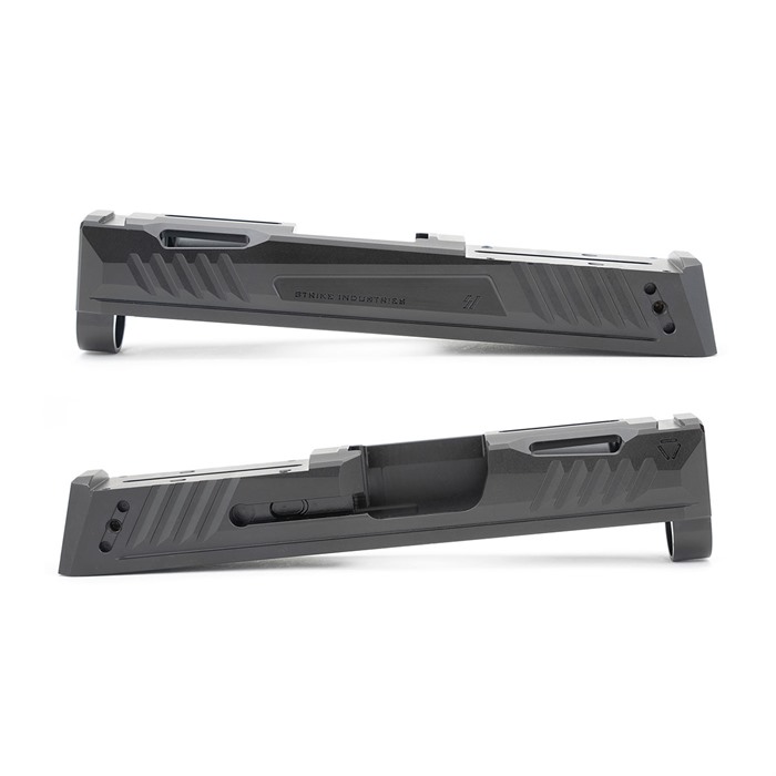Strike Slide er stolt designet med holdbarhet og funksjon i tankene, sammen med Strike Industries' stil. Store, forbedrede, aggressive front- og bakserrasjonsområder hjelper til med å manipulere sliden for å sjekke kammeret eller fjerne en blokkering, sammen med de medfølgende venstre og høyre ladingshåndtakene plassert mot baksiden av sliden. De to store portutskjæringene fremhever enhver stilisert løpetype og gir også en raskere syklustid med sin lette struktur og forbedret luftstrøm.