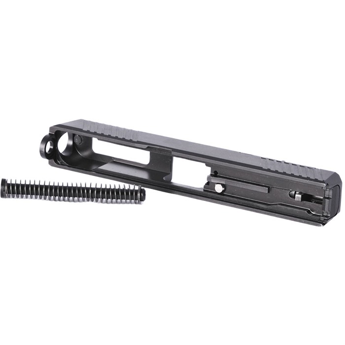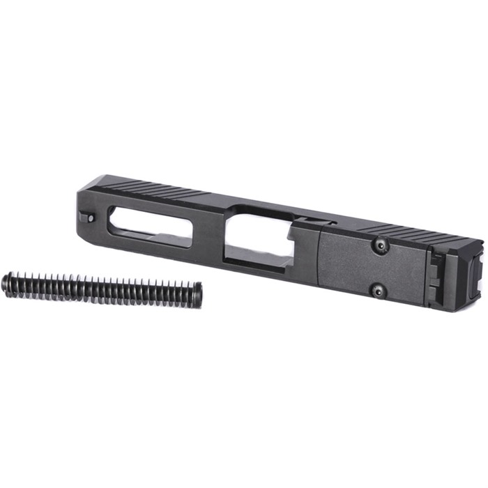 Optic-Ready Enhanced Slide With Unique Ergonomic & Performance Upgrades The Brownells RMR Slide for Glock® 19 Gen3 pistols is the ideal upgrade for your factory G19 or the perfect enhanced slide for a brand-new custom gun built on a compatible frame from another manufacturer. This slide features a pre-cut slot for easy, secure, low-profile mounting of a reflex red dot sight that fits the Trijicon RMR footprint. If you're not mounting a red dot at the moment, we've included a lightweight polymer cover plate to neatly fill the slot. Our RMR Slide comes with standard-height front and rear sights, which can serve as your primaries or as backup "iron" sights when paired with a red dot sight. You can get your Brownells RMR Slide for Glock® 19 Gen3 with the standard solid top or with a "window" cutout up front that enhances air flow to cool the barrel - ideal for hard-working action competition pistols. If you have an upgraded barrel with a contrasting finish or a unique exterior pattern (fluting, spirals, flames, etc.) the window lets you show it off! Or install our ported barrel for Glock 19, and combustion gas venting from the barrel ports through the window will counteract muzzle rise and help you keep the sights on the target for subsequent shots. There's no need to install a bulky compensator on the muzzle, which means your new comped pistol will still fit standard holsters for the Glock® 19. Fits Gen3 Glock® 19 pistols & clones Built-in mounting slot for reflex sights with the Trijicon RMR footprint Factory front/rear iron sights installed Optic slot cover plate & recoil spring assembly also included Machined from 416 stainless steel billet, black Nitride finish Available with traditional Solid top or distinctive top Window cutout Each RMR Slide for Glock® starts life as a billet of 416 stainless steel that is machined to Glock® factory specifications inside, so it’ll accept factory or aftermarket barrels and internal "small" parts. Each slide comes with a tough, wear-resistant black Nitride finish. This slide fits standard Glock® factory G19 frames and compatible aftermarket frames. On the sides at the rear, you'll find distinctive wide, shallow cocking serrations that give excellent "purchase" to rack the slide, plus a mirror set of serrations up front that aid in manipulating the slide to press-check the chamber. Both sets of serrations make it easy to manipulate your pistol's slide from any angle and in any position. And we'll admit it: these serrations just look cool, too! Whether you're doing an ambitious "built from scratch" custom pistol or you're upgrading a factory Glock 19 for enhanced versatility, a Brownells slide is the perfect component for your project! Brownells Gun Tech™ Note: Channel liner required for these slides (#078000649). Channel liner is a press fit and requires a tool to install; we recommend #777100017.