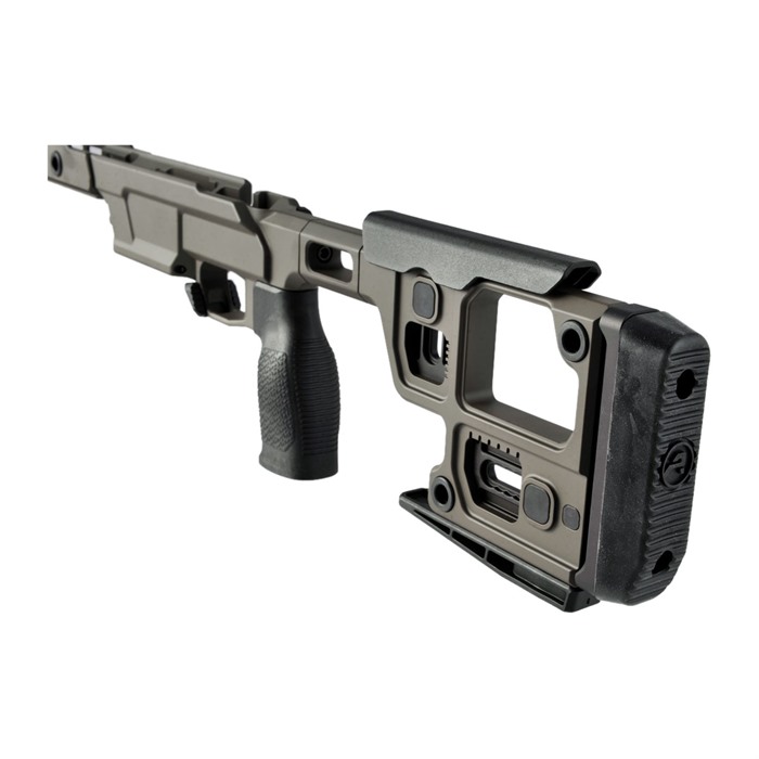 AERO PRECISION SOLUS COMPETITION CHASSIS The Solus Competition Chassis was designed to create the most precise and repeatable rifle to body connection. Modularity is another critical component of the Solus chassis a high focus on general ergonomics and adjustability ensures chassis fitment goes smoothly. Integrating industry-standard attachments like M-LOK and Arca Swiss allows a true custom experience no matter the intended use. Chassis Center Section Features: Remington 700 short action footprint V-Block bedding surfaces to ensure consistent lockup among different manufacture actions. Compatibility with AICS and AIAIW detachable box magazines Ambidextrous magazine catch Adjustable magazine catch (to accommodate for variances in magazine tolerances) Adjustable thumb rest Compatible with tangless AR15 pistol grips. Machined from custom 7075-T6 aluminum forgings Forend Features: Arca and M-LOK compatible forend with M-LOK slots at the 3,6 and 9 o'clock positions 6 QD sling sockets Compatible with Aero Precision's optional night vision bridge and bipod spigot Can accommodate up to 1.25" barrel diameters Stock Features: 7-position adjustable length of pull Variable position adjustable cheek comb Adjustable cant recoil pad 5 QD sling sockets Included bag rider