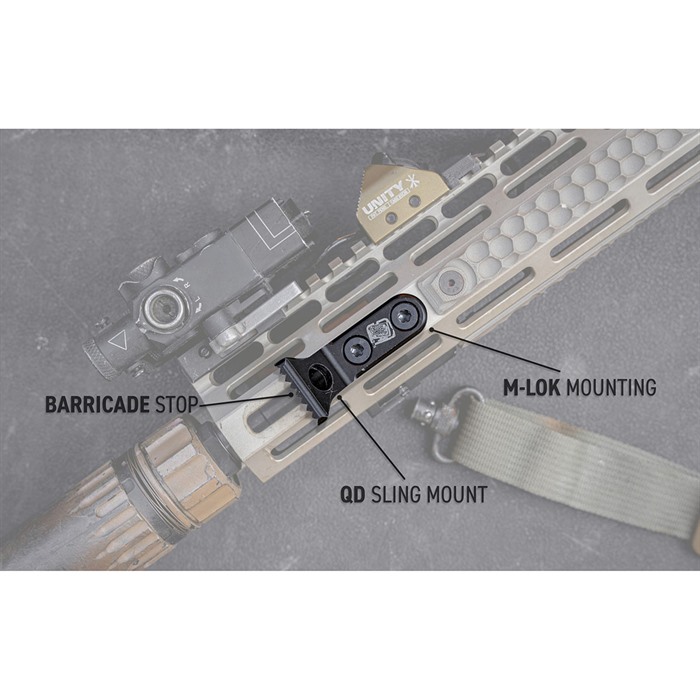 SONS OF LIBERTY GUN WORKS Presscheck Barricade Stop er et presisjonslaget M-LOK tilbehør som oppnår to funksjoner i samme fotavtrykk; det fungerer som en Barricade Stop og en QD Sling Mount.