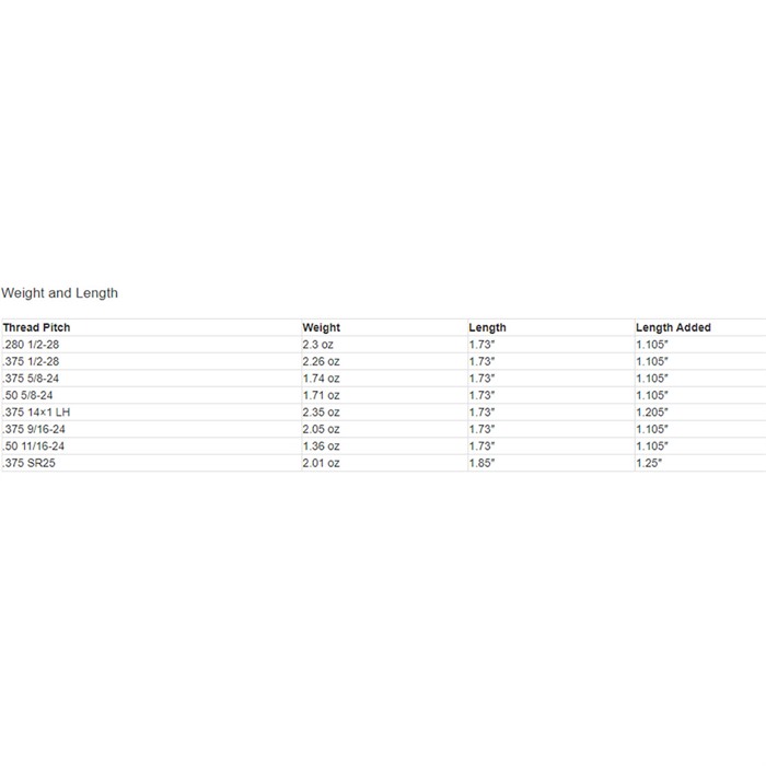 850041491462 SPB MUZZLE BRAKES Disse passer til Plan B-type monteringer. Bruk alltid en justeringsstang for å sikre at hele systemet er korrekt satt opp. Sørg for at alle overflater er rengjort, og at munningsenheten er strammet og Rockset til løpet. Bruk på en Q kan annullere garantien, vær oppmerksom. Stram munningsenheten til omtrent 15-25 fotpund. Sørg for at munningsenheten er kvadratisk mot skulderen. Når du setter lyddemperen på munningsenheten, sørg for at gjengene og konene er rene. Stram lyddemperen til 10 fotpund. Sørg for justering. Nyt. Nitride-finishen gir en tettere forsegling, med det sagt, er det ekstremt viktig å stramme og rocksette munningsenheten til løpet på riktig måte. FUNKSJONER: 17-4 PH H900 Atlas og Atlas XL Kompatibel Plan B Kompatibel Atlas-adapter Overrun Omtrent 1.050″ Atlas XL-adapter Ingen Overrun Svart Nitride-finish (67 HRC Overflatehardhet) Shim inkludert* UNNTATT *Shim ikke inkludert med SR25/M110 eller 11/16×24Restordre. Sendes når kommer til lager. Leveringstid ca 4-12 uker fra USA lager.