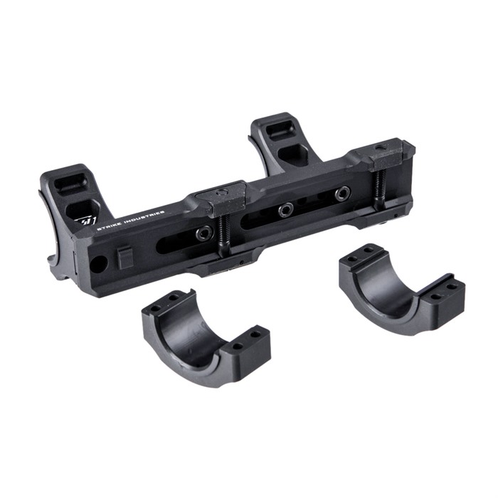 The Strike Industries Adjustable Scope Mount (ASM) combines different eye relief options into one scope mount. The ASM can be set to one of four (4) Standard, Extended, Intermediate Extended and Hyper Extended positions. The ASM is CNC machined from 7250 aluminum and hard anodized in black. 7250 aluminum excels in applications requiring lightweight and high strength. Intended for use with Picatinny rail section rifles. The versatility of the Strike Industries Adjustable Scope Mount allows users to adjust the scope away from the shooter and closer to the shooter when mounted in reverse for a hunting rifle setup, creating flexibility for various eye relief and scope positions. SCOPE TUBE SIZE: 30mm or 1 inch CLEARANCE BETWEEN RINGS: 70.18mm CENTER OF TUBE ABOVE RAIL: 36.68mm LENGTH: 143mm WIDTH: 45mm HEIGHT: 63mm WEIGHT: 7.6 oz