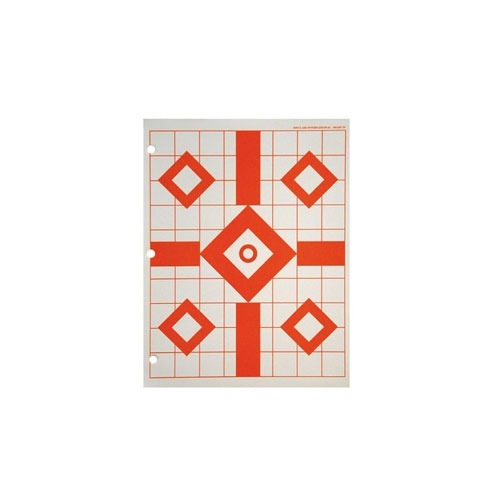 Vårt sikte-mål består av 4 små diamanter som omgir en stor sentrum diamant, overlagt på et rutenett med 1 tommes kvadrater. Diamantene og rutenettet er trykt i fluorescerende oransje på hvit, tung papp, slik at skuddene dine blir tydelige og klare. Utmerket for forhold med lite lys. Målene på målene er 8-1/2 x 11 tommer og selges i blokker med 25.Leveringstid ca. 14-21 dager.