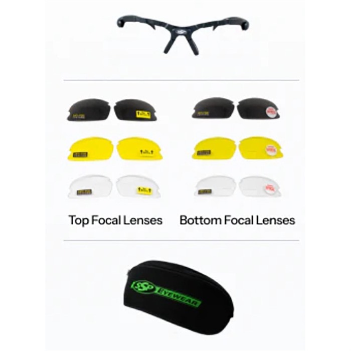 SSP EYE WEAR TOP FOCAL® ULTRA KIT INTERCHANGEABLE SHOOTING GLASSES SSP Eye Wear’s comprehensive kit includes both top and bottom focal lenses, catering to the needs of shooters, instructors, mechanics, electricians, and readers alike. With this versatile solution, say goodbye to blurry sight pictures and neck strain, and hello to effortless target acquisition and enhanced visibility. Whether you're on the range or tackling overhead work, their kit ensures crystal-clear focus, making it the ultimate choice for a wide range of tasks and users. TECHNOLOGY: Exceeds ANSI Z87.1+2015 | UV 400 Protection | TR-90 Frame | Anti-Fog and Anti-Scratch Coatings | Distortion-free. FEATURES: Top Focal Lenses: Designed with magnification near the top of the lenses, Top Focal technology ensures in-focus front sights or overhead work, eliminating the need for neck strain associated with regular bottom bifocals. Anti-Fog and Anti-Scratch Technology: Enjoy uninterrupted visibility with our double-sided anti-fog coating, bonded permanently to the lens for lasting clarity. Additionally, the lenses feature a durable anti-scratch hard coating, ensuring long-term durability and performance. Optically Correct Lenses: Experience distortion-free vision with their optically correct, de-centered, shatterproof polycarbonate lenses, providing sharp peripheral vision without any blind spots. DESIGNED FOR: Pistol shooters, instructors, mechanics, electricians, and anyone requiring magnified vision for close-up tasks. Whether you're aiming for precision on the range or working overhead, these kits provide the clarity, comfort, and performance needed to stay on target and achieve optimal results. INCLUDED IN BOX: Total 6 Interchangeable Lens (3 Top focal and 3 Bottom focal lenses) in amber, clear, and smoked variations | A Neoprene Zipper Pouch | Lens Changing Instructions