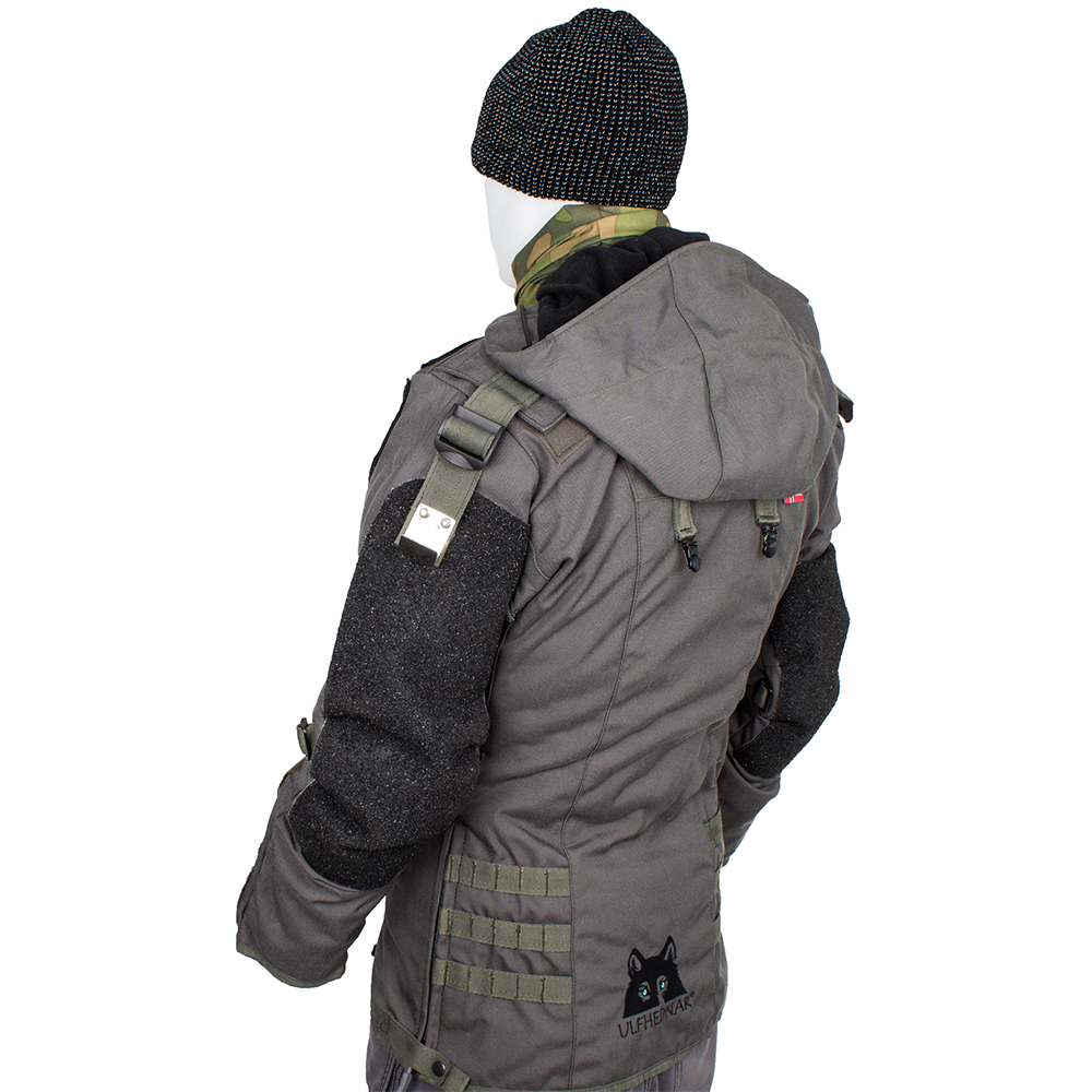 Jakken har Kevlar-beslag på spesielle deler, store lommer og hette, som også er viktige utstyrsfunksjoner for skytejakken.